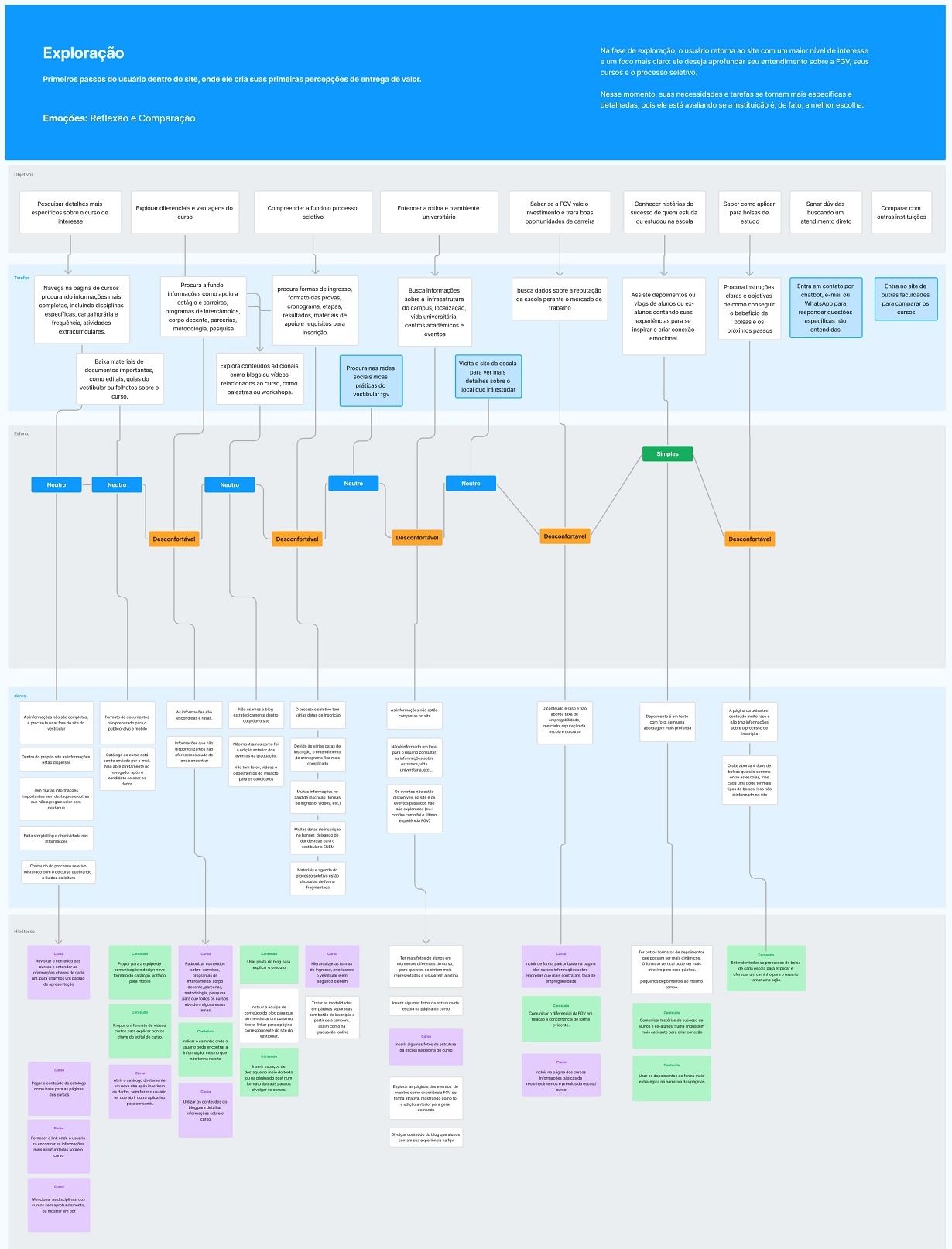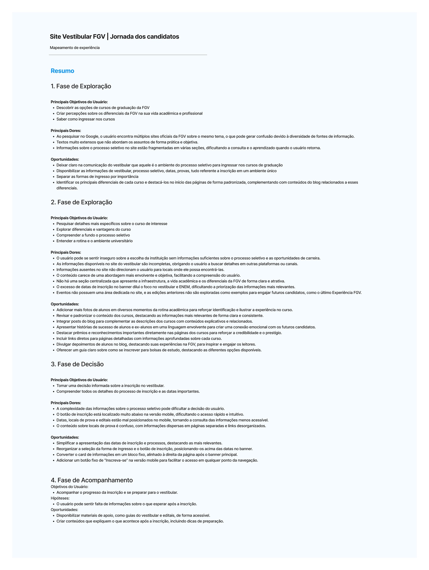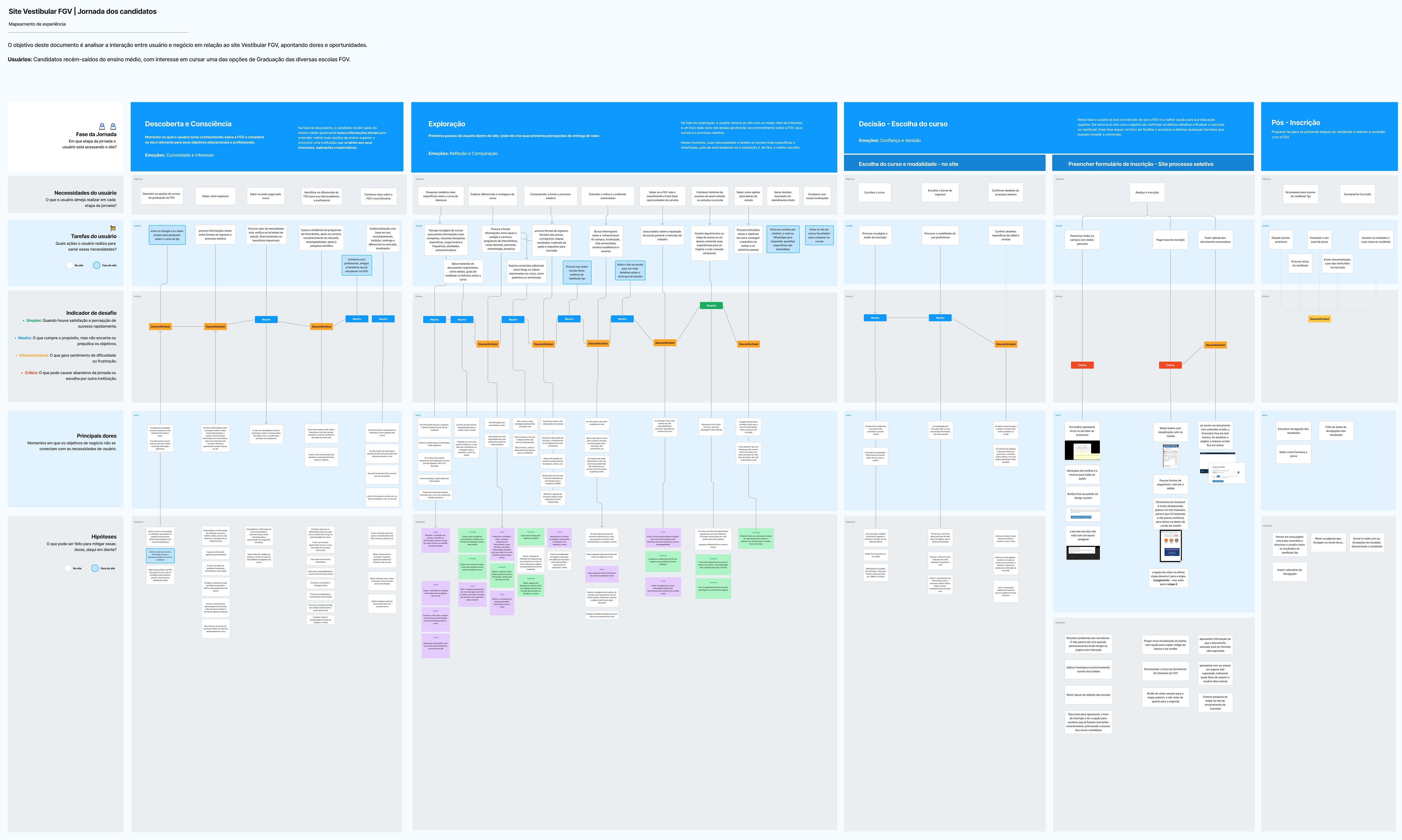 I led the user journey mapping for the FGV Undergraduate website to identify opportunities to improve conversion, engagement, and overall clarity throughout the candidate experience. By analyzing the full journey, from awareness and exploration to decision and post-registration, I uncovered key friction points such as fragmented information, unclear content hierarchy and usability issues, particularly on mobile. This work directly informed UX and content hypotheses focused on centralizing admission information, standardizing course pages, prioritizing critical data such as enrollment methods and key dates and strengthening storytelling through course differentiators and student experiences.