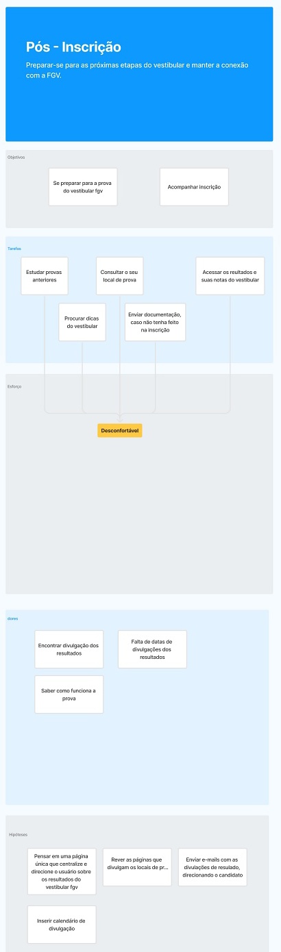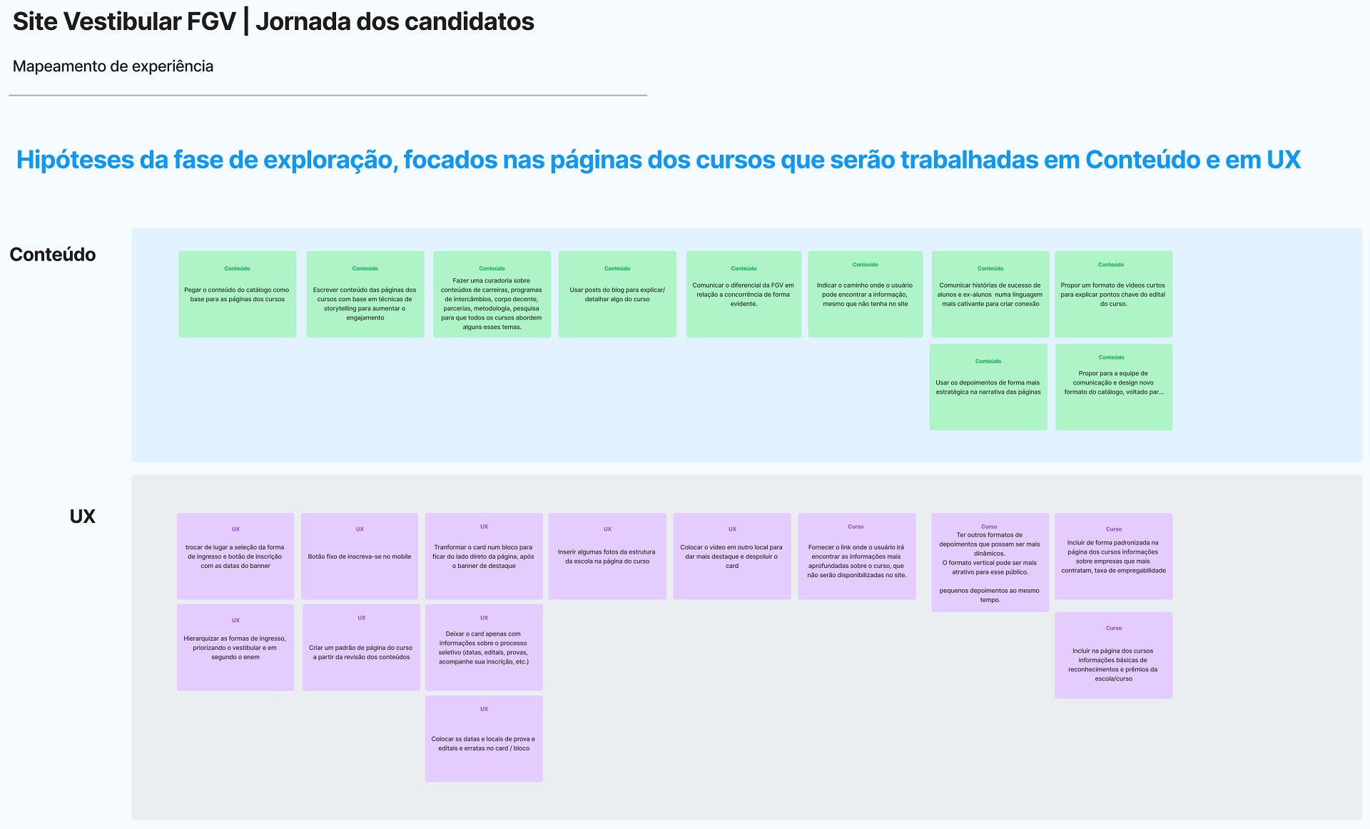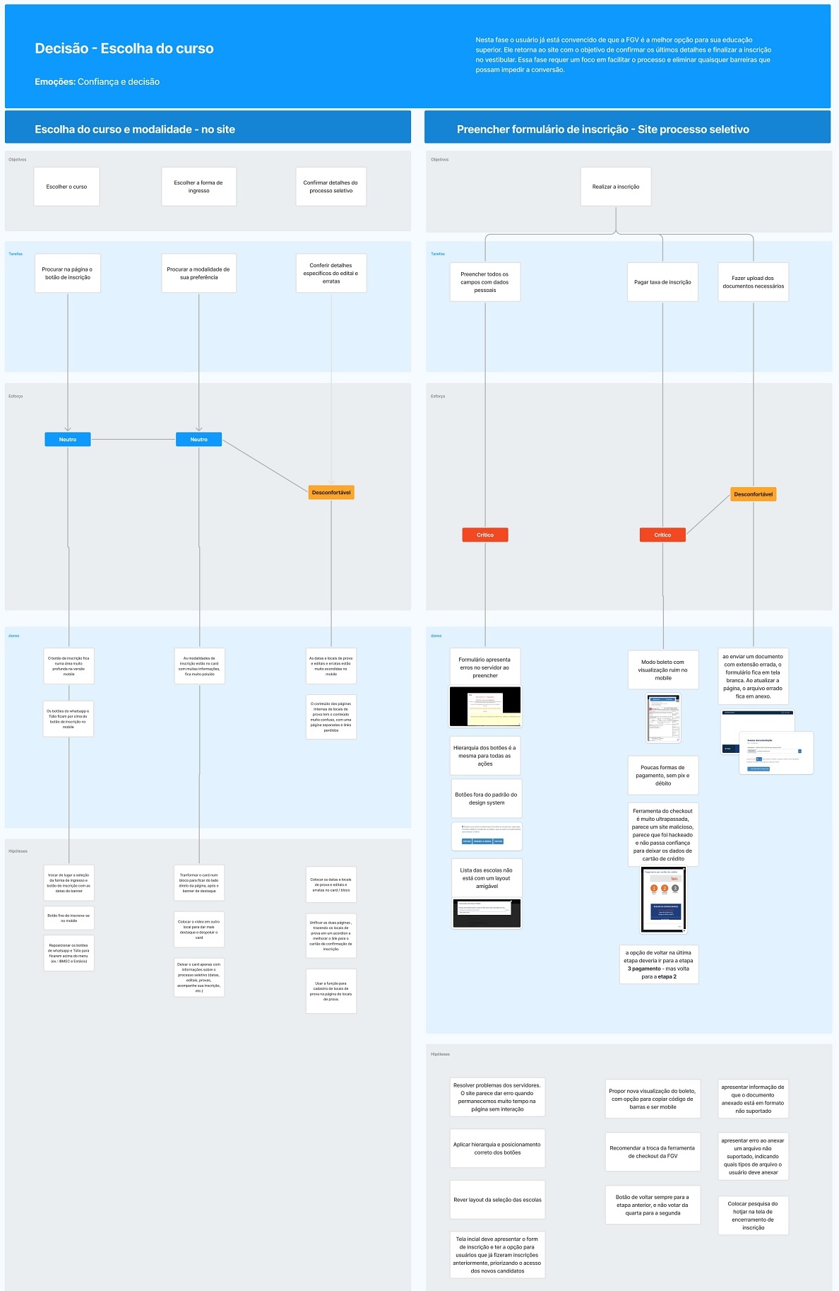 I led the user journey mapping for the FGV Undergraduate website to identify opportunities to improve conversion, engagement, and overall clarity throughout the candidate experience. By analyzing the full journey, from awareness and exploration to decision and post-registration, I uncovered key friction points such as fragmented information, unclear content hierarchy and usability issues, particularly on mobile. This work directly informed UX and content hypotheses focused on centralizing admission information, standardizing course pages, prioritizing critical data such as enrollment methods and key dates and strengthening storytelling through course differentiators and student experiences.